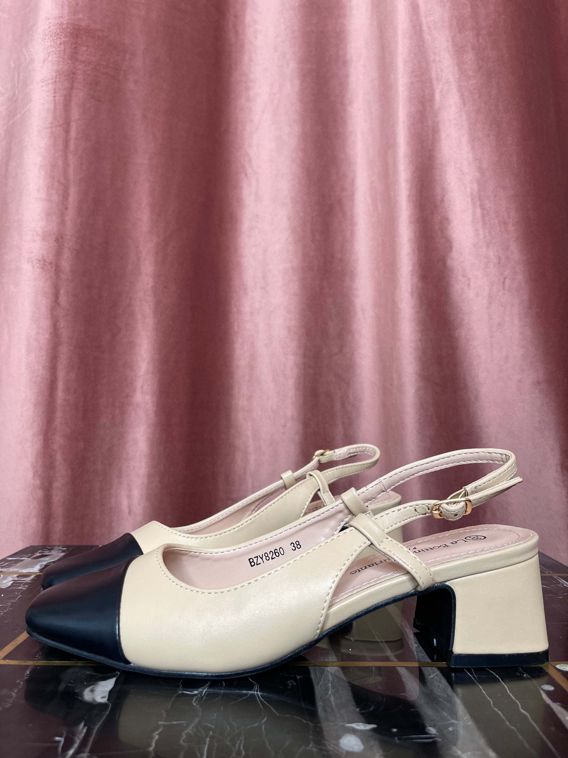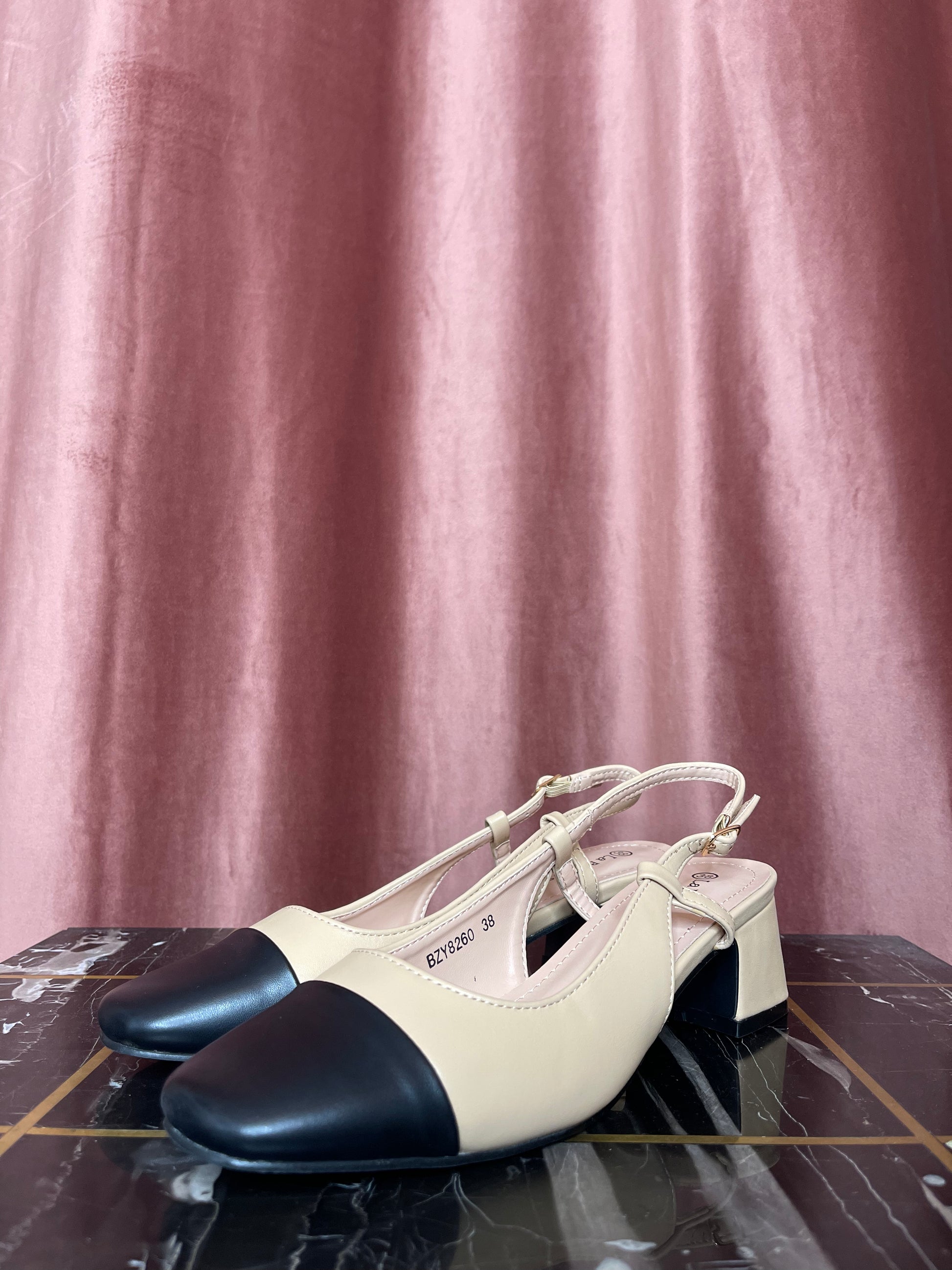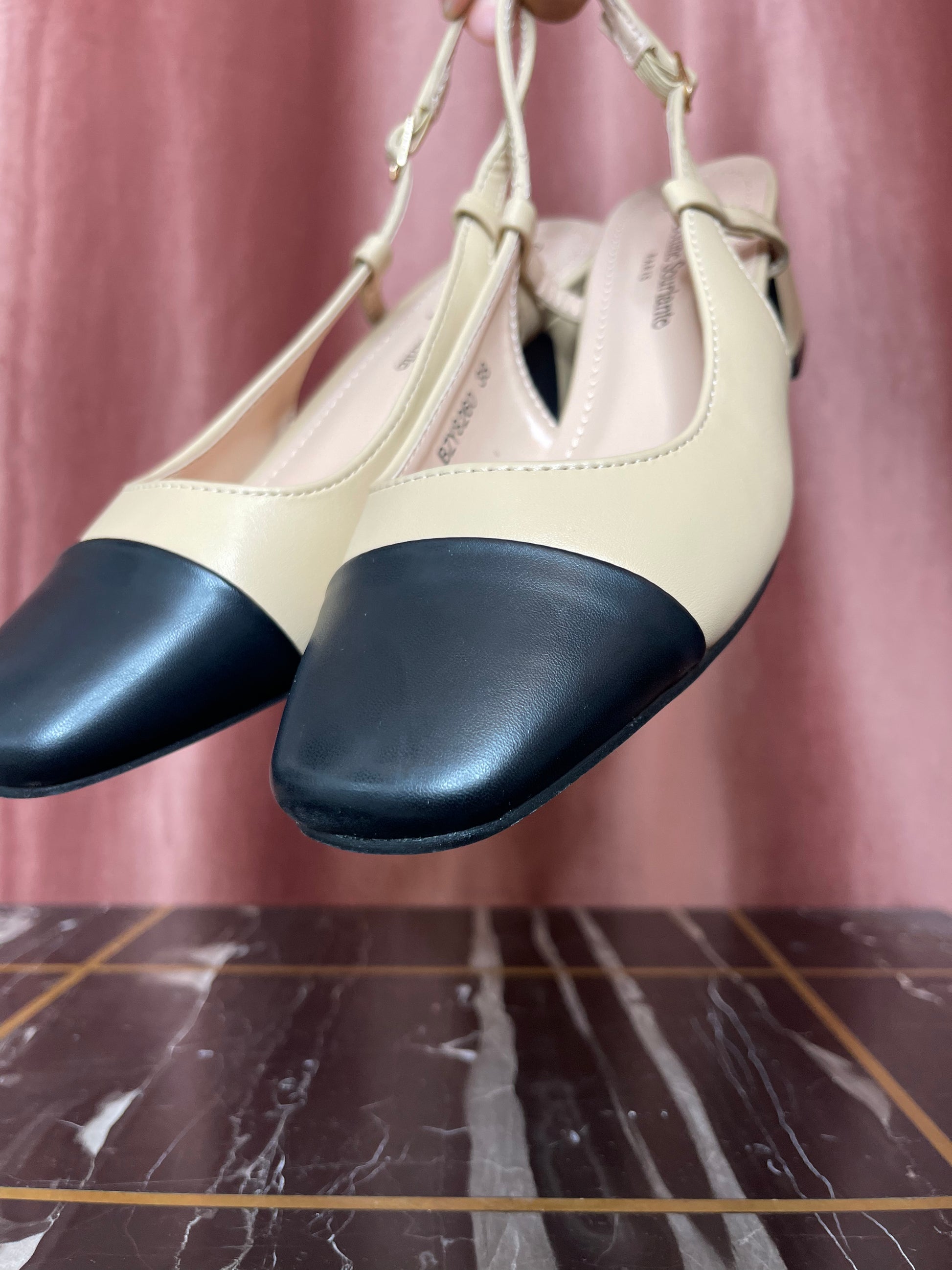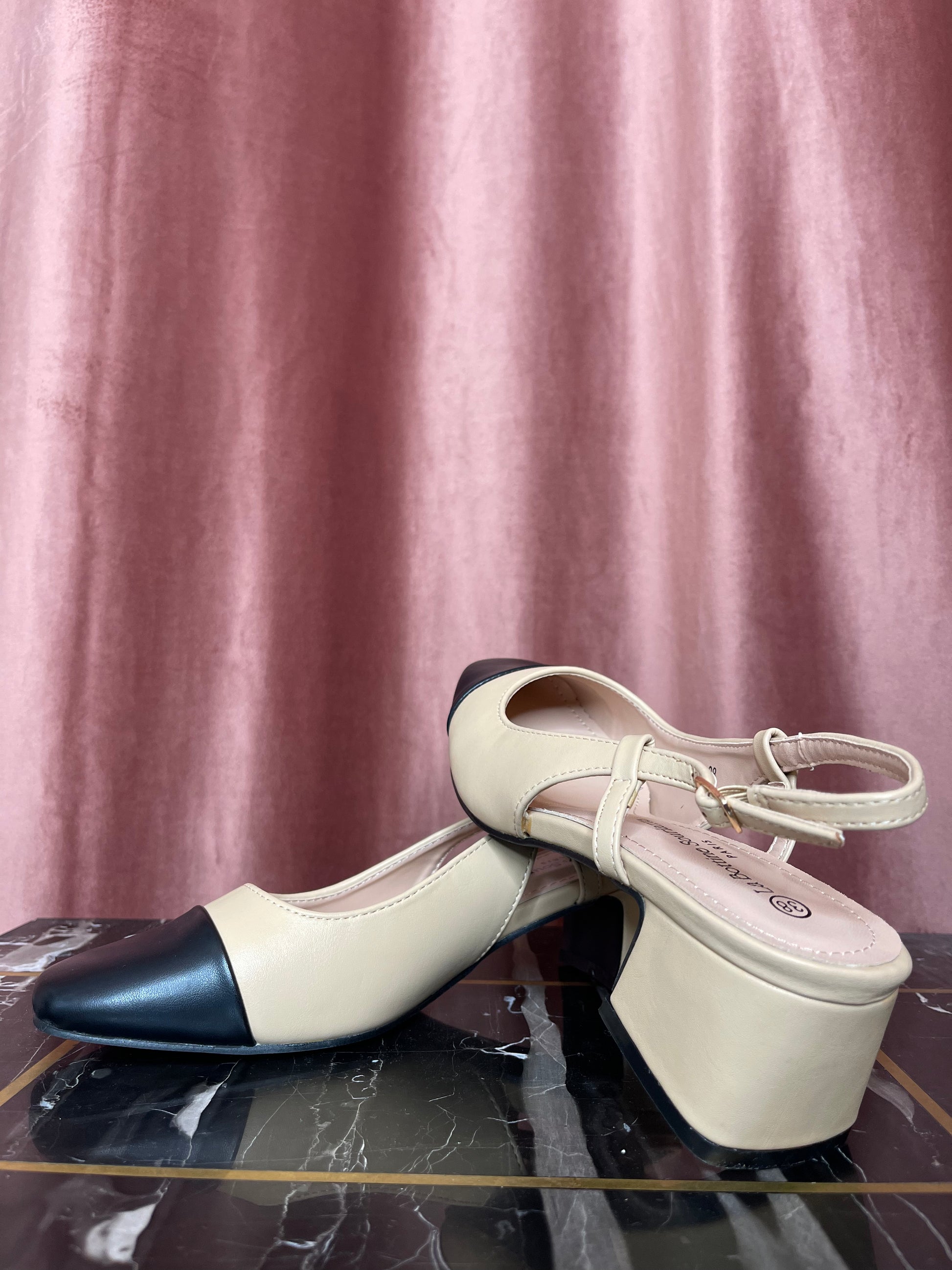 Escarpins bicolores à petits talons.