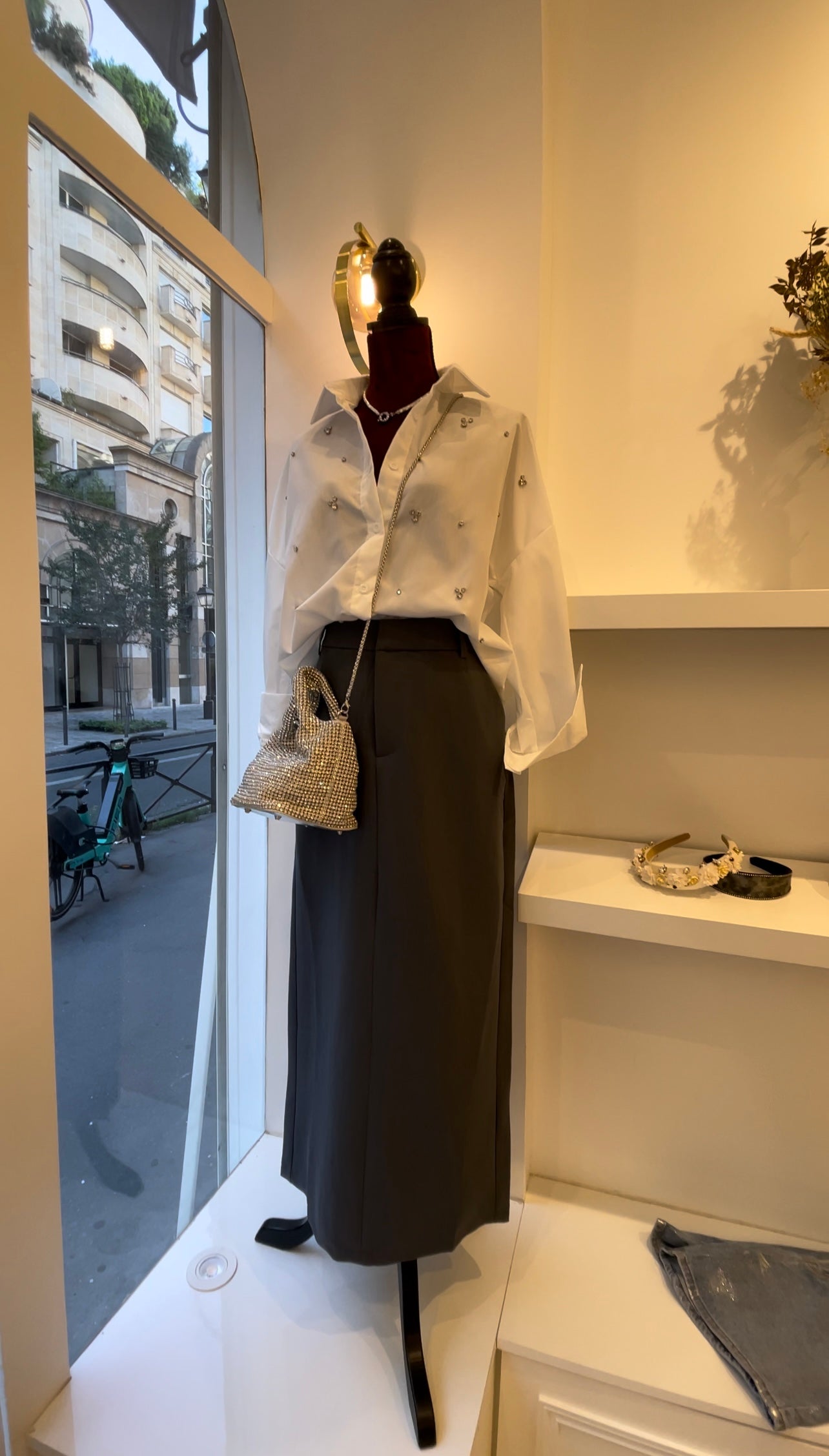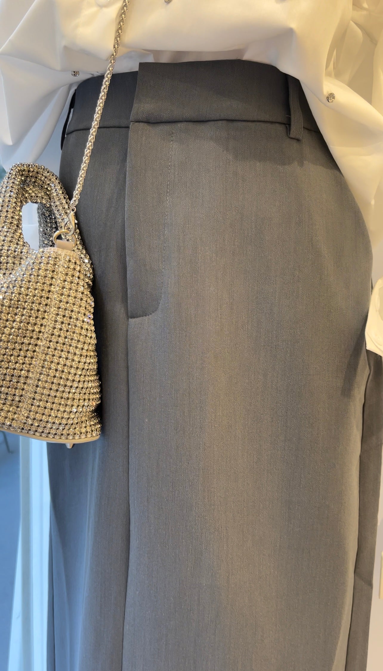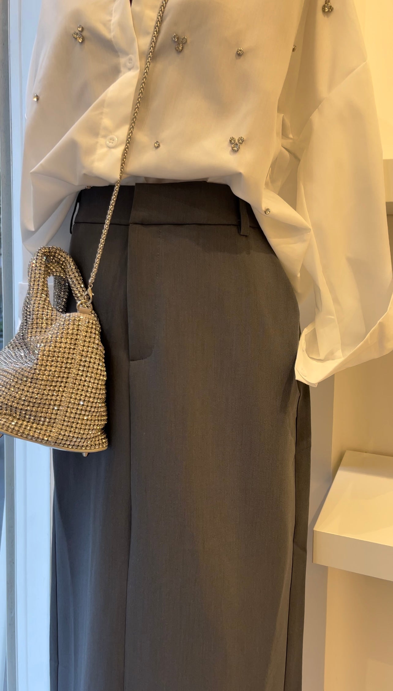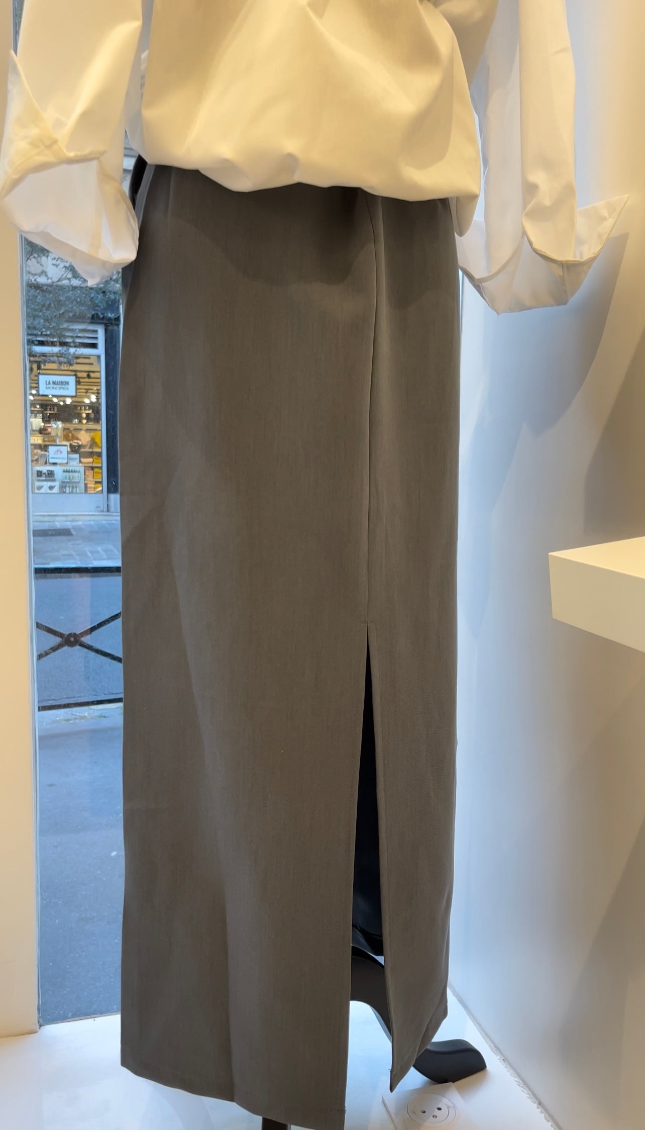Jupe longue taille haute, avec fente à l’arrière.